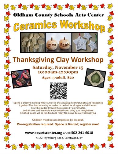 Finished pieces will be kiln-fired and ready for pickup before Thanksgiving.